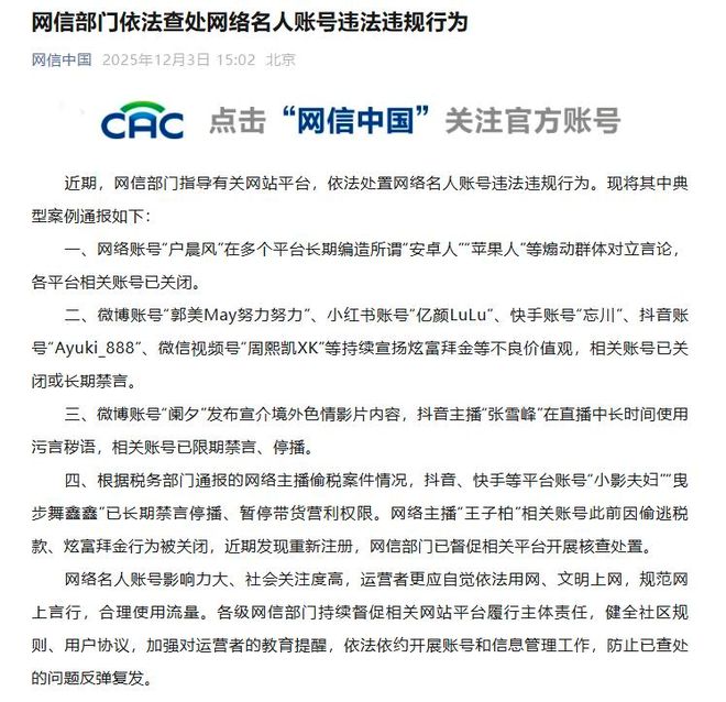网信部门明确强调,网络名人账号影响力越大,越应自觉依法用网、文明上网,规范网上言行。